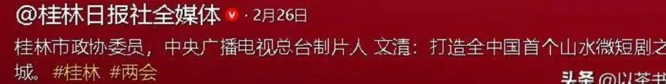 她还是桂林市政协委员,连任六届那种。 2026年两会期间,她带了打造“山水微短剧之城”的提案,说桂林有漓江、龙脊梯田,有明代藩王文化和抗战底蕴,还有米粉、油茶这些烟火美食,发展微短剧产业能给文旅注入新活力。