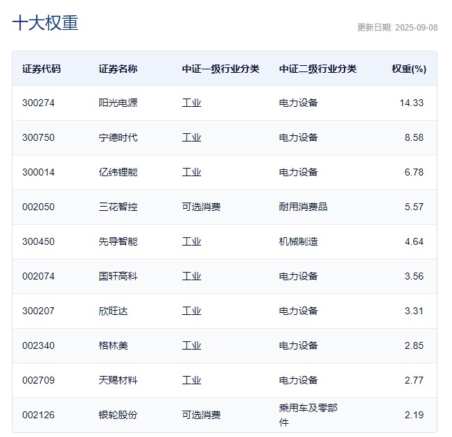 截至9月8日,中证电池指数前十大权重股包含阳光电源、宁德时代、亿纬锂能、三花智控、先导智能、国轩高科、欣旺达、格林美、天赐材料、银轮股份。