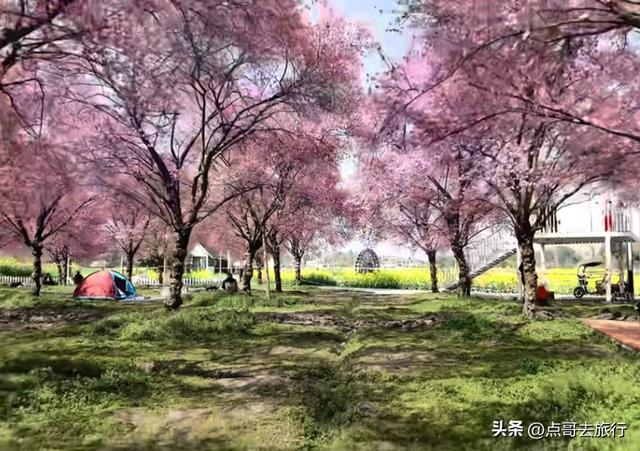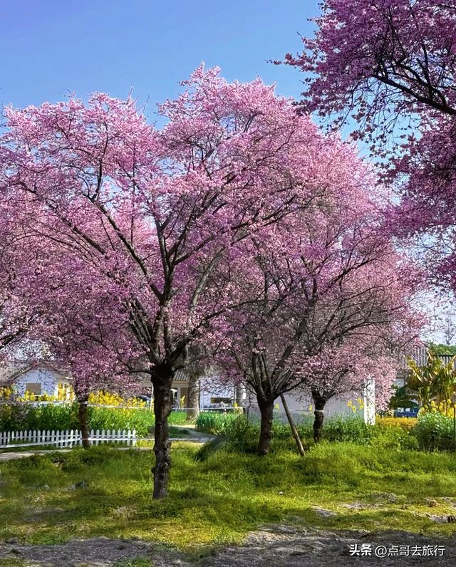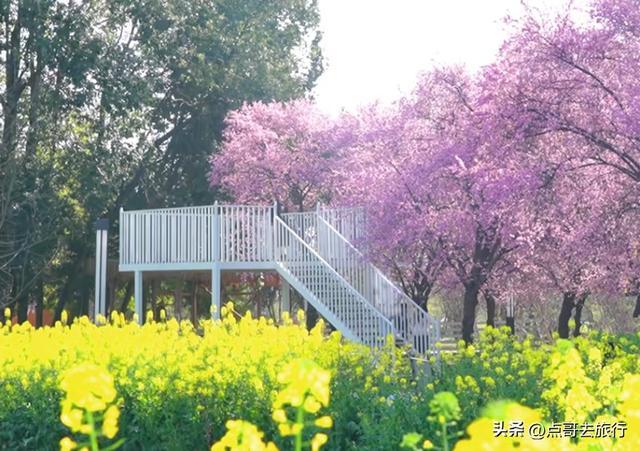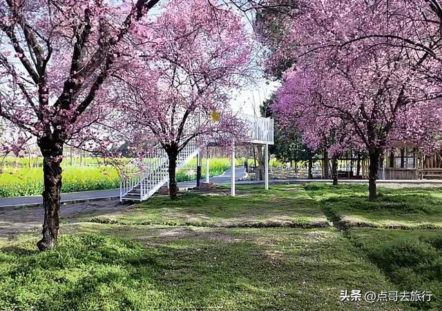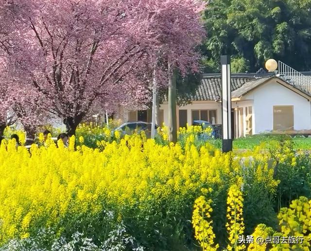 这里最绝的,不单单只是美人梅的美。在粉艳的梅林旁,还有一片规模不小的油菜花。这两种颜色撞在了一起,粉的温柔、黄的热烈,再衬着青青的麦苗和林盘中的农家小院,把春天的色彩发挥到了极致。在梅林边,还有一座纯白色、洋气的观景台,在蓝天、粉花、金黄的包围下,显得特别唯美,不少人在此拍照。站在上面,你会感受到戚家湾的春天,简直就是一首色彩丰富的田园诗。
