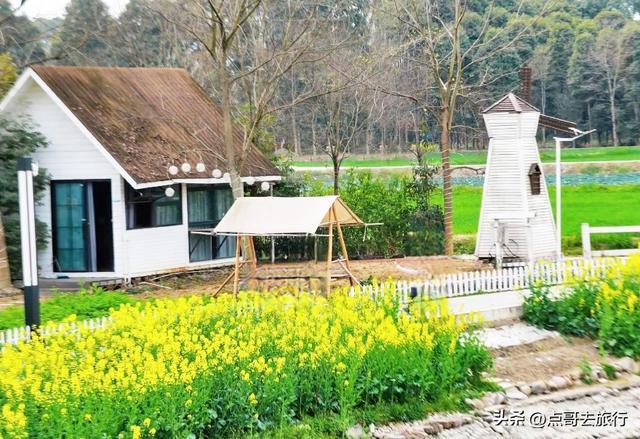 戚家湾确实美,用一步一景来形容,一点都不夸张。沿着泥土小路,走到黑石河边,你会看到一个大大的水车。木制的大水车,架在小河边,慢悠悠地转动,成为田园里最别致的风景。河边绿油油小草,软软的,偶有几苗野生的蔬菜,在春风中轻轻摇晃,满眼都是清新的绿意。黑石河上,还架着一座吊桥,走在上面晃晃悠悠,第一次走在上面还有点小紧张;脚下是清澈的河水,身旁是飘香的花海,这氛围感直接拉满。河边不远处,还有一座白色的景观小屋,简约又文艺,让这片田园多了几分浪漫。