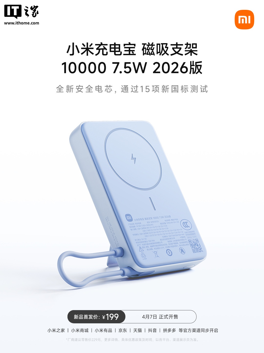要求强化电池本质安全,在标准中引入针刺试验,明确提升移动电源在高温、过度充电、挤压等场景下的安全防护能力。为了降低移动电源长期使用后的内部短路风险,新增了循环老化方面的专业检测,同时要求标明建议安全使用年限,提醒消费者及时更换安全性差的移动电源。小米首款满足最新国标的充电宝今日正式发布,小米充电宝磁吸支架 10000 7.5W 2026 版现已开售,首发价 199 元。