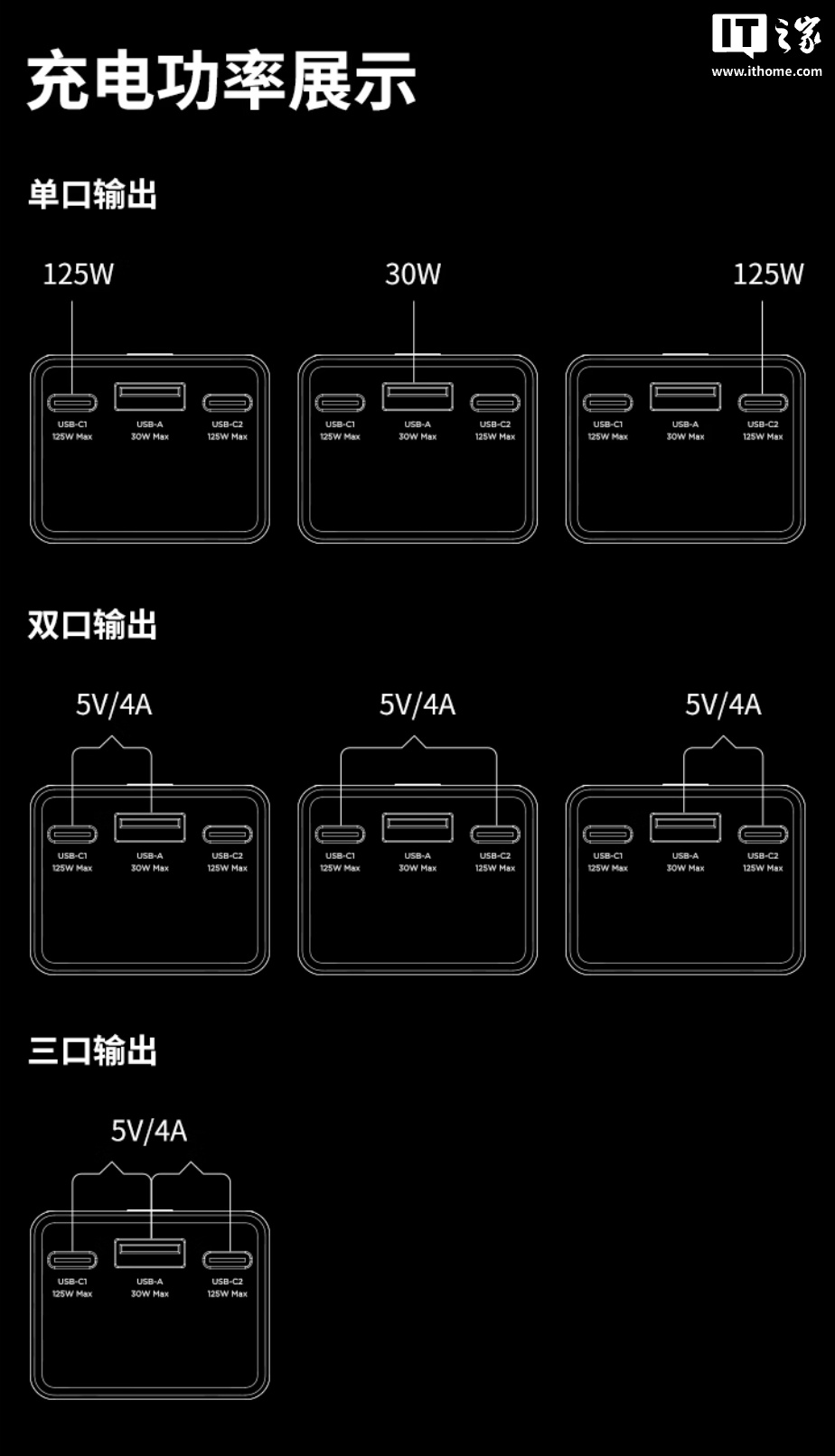 该产品整体重量 308g,正面配备一块 LED 数显屏,可显示电量、输入 / 输出功率。产品匹配 2 个 USB-C 和 1 个 USB-A 接口,其中 USB-C1/2 均支持 125W 输出,USB-A 支持 30W 输出。