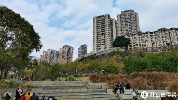 从公园入口马路溜下来穿过广场就是江边了。回望,山头上红色高楼就是刚才穿过的江山多娇小区。